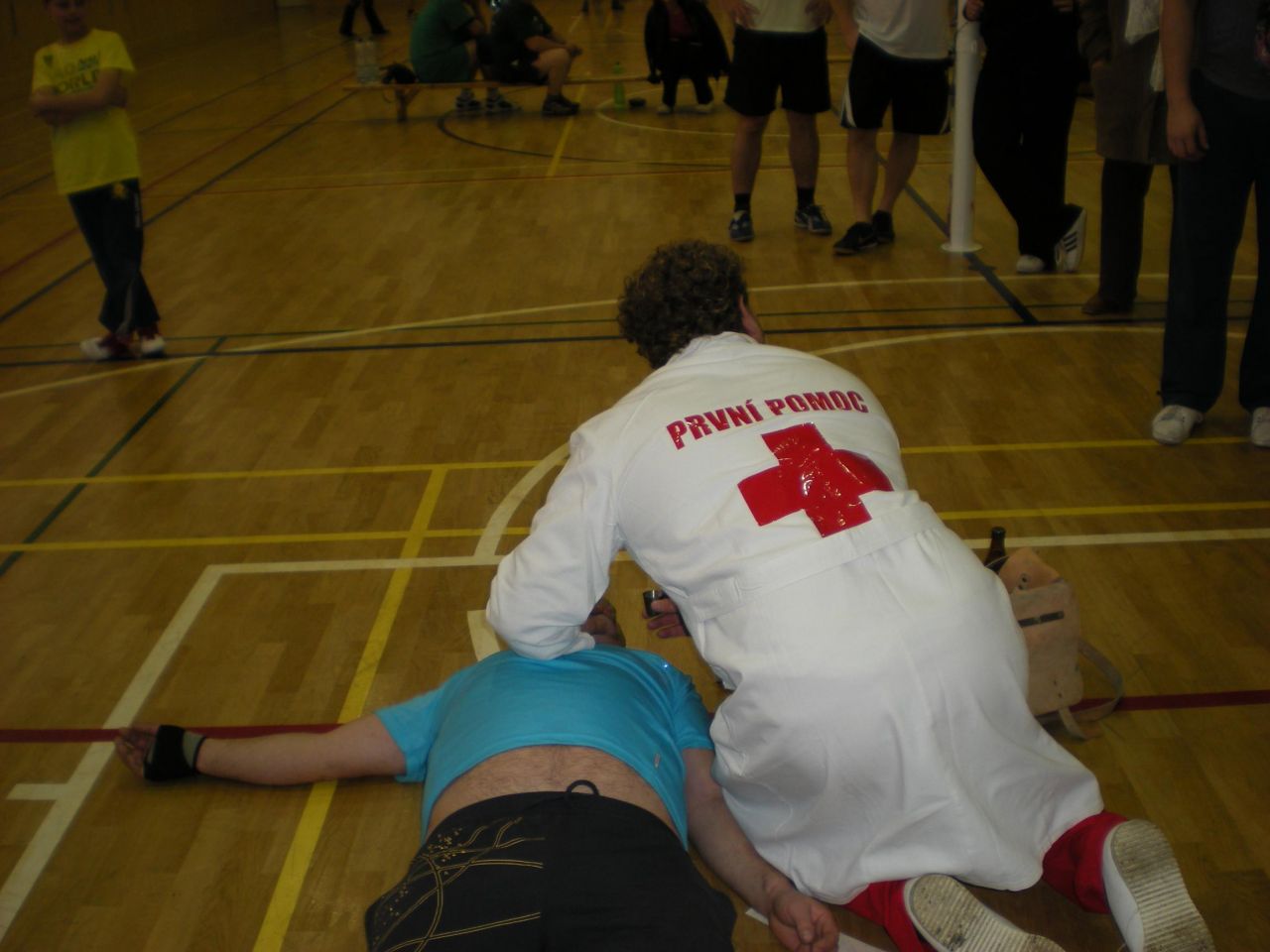 Poněvadž podstatnou část volejbalového kroužku v Janové tvoří humoristicko-satirické uskupení Džejmsovci, nesměl zde chybět jejich originální výstup. Ovšem pro některé v prvních vteřinách o humoru nemohla být ani řeč. „Zdravotník,“ ozval se zděšený výkřik z hrací plochy jednoho ze dvou hřišť. Na zemi leželo bezvládné tělo samotného Josefa Džejmse Pončíka. Hráči, a především hráčky, z vedlejšího hřiště přestali hrát a vystrašeně sledovali situaci. Ale to se již od vchodu blížil ranhojič Michal Řepka a vážné tváře se v tu ránu vykrojily do úsměvů.
